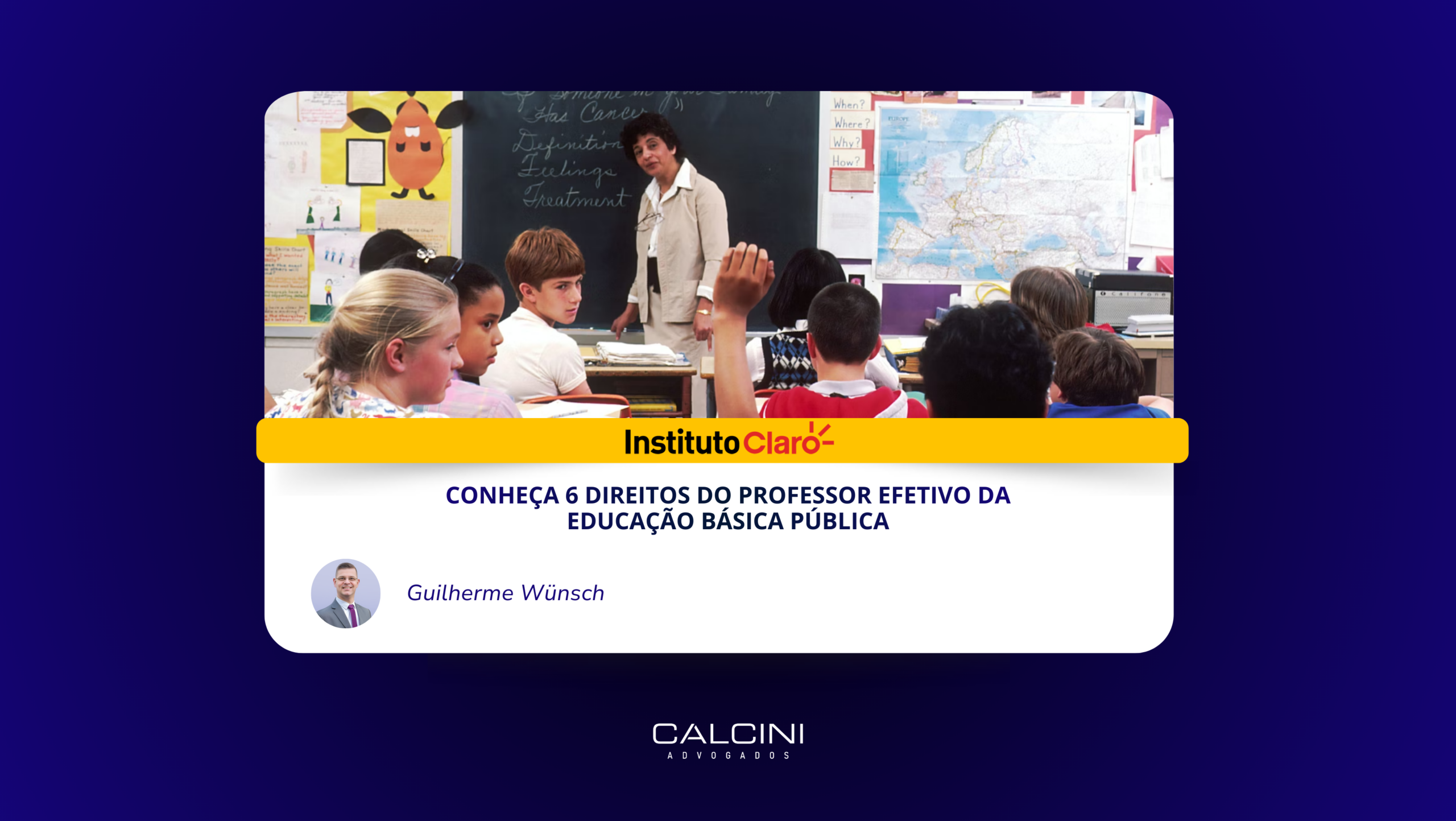A importância de garantir direitos trabalhistas e valorização profissional dos docentes da educação básica pública é destaque no Instituto Claro. Na reportagem, Guilherme Wünsch, consultor da Calcini Advogados e professor da Unisinos e da UFRGS, destaca que, além da Constituição Federal, a Lei de Diretrizes e Bases da Educação Nacional (Lei nº 9.394/1996) e a Lei do Piso do Magistério (Lei nº 11.738/2008) asseguram direitos essenciais aos professores, como o piso salarial nacional e a previsão de jornada com tempo destinado a atividades extraclasse.